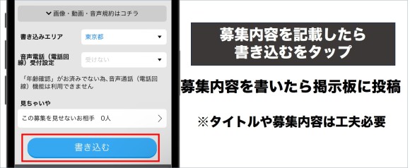 募集内容は「どんなお店に行くのか」「どの辺りで待ち合わせをするのか」など、なるべく詳細に記載しておきましょう。相手側も連絡がしやすくなるため、効率良く出会える可能性が高いです。