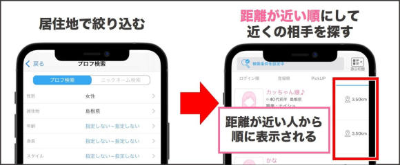距離が近ければ移動にかかる労力が少ないので、遠い場所にいるよりも出会いやすいです。また、距離検索をしながら、年齢や身長などの条件も同時に絞って探せます。