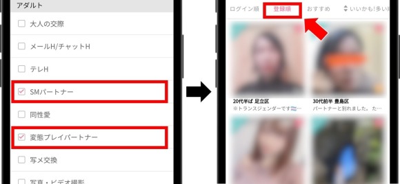 探し方は簡単で、絞り込み機能で興味あること(利用目的)を「SMパートナー」に設定します。並び順を『登録順』に変更するのがおすすめです。