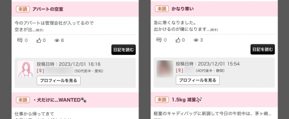 日記はSNS感覚で日々の出来事をつぶやく機能です。直接出会いには繋がりませんが、男性でも投稿やコメントが無料で利用できます。