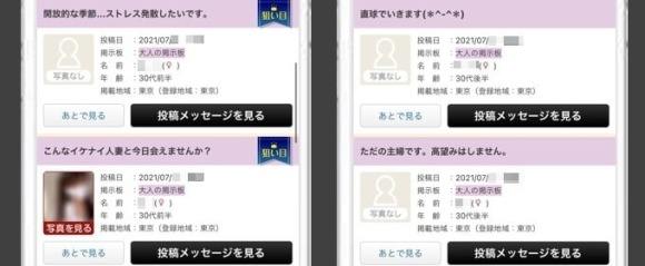 掲示板は「友達募集」「恋人募集」など目的に合った相手を募集する機能です。自分で募集を投稿したり、女性の投稿を見たりできます。