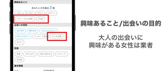 援デリ業者同様にエッチなプロフィールを作りがちです。メッセージ上でしっかり会話ができたり、単刀直入に「大人の関係を求めています」と書くなど、援デリ業者とは様子が異なります。