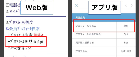 一方のWeb版でプロフィールを閲覧すると、1ポイント(10円)かかります。1回1ポイントでも、塵積でどんどんポイントが減ってしまうので、プロフィール閲覧はアプリ版がおすすめです。