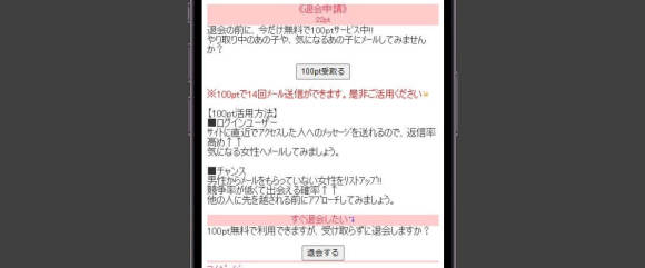 JメールのWeb版のみですが、退会申請をすると退会を引き留めるために運営が100ポイントをくれます。ただし、必ずもらえるわけではなく、下手すると本当に退会してしまうので、最後の手段として、自己責任で利用しましょう。