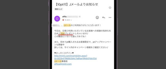 Jメールにメールアドレスを登録しておくと、不定期で無料ポイントがもらえるメールが届きます。ポイントはメール内のURLからJメールにアクセスするだけで、簡単にもらえます。
