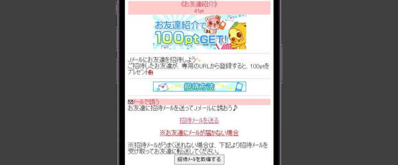 JメールのWeb版にはお友達紹介制度があり、1人紹介する毎に100ポイントがもらえます。招待メールを友達に送り、リンクから友達がJメールに登録すればポイントが還元される仕組みです。