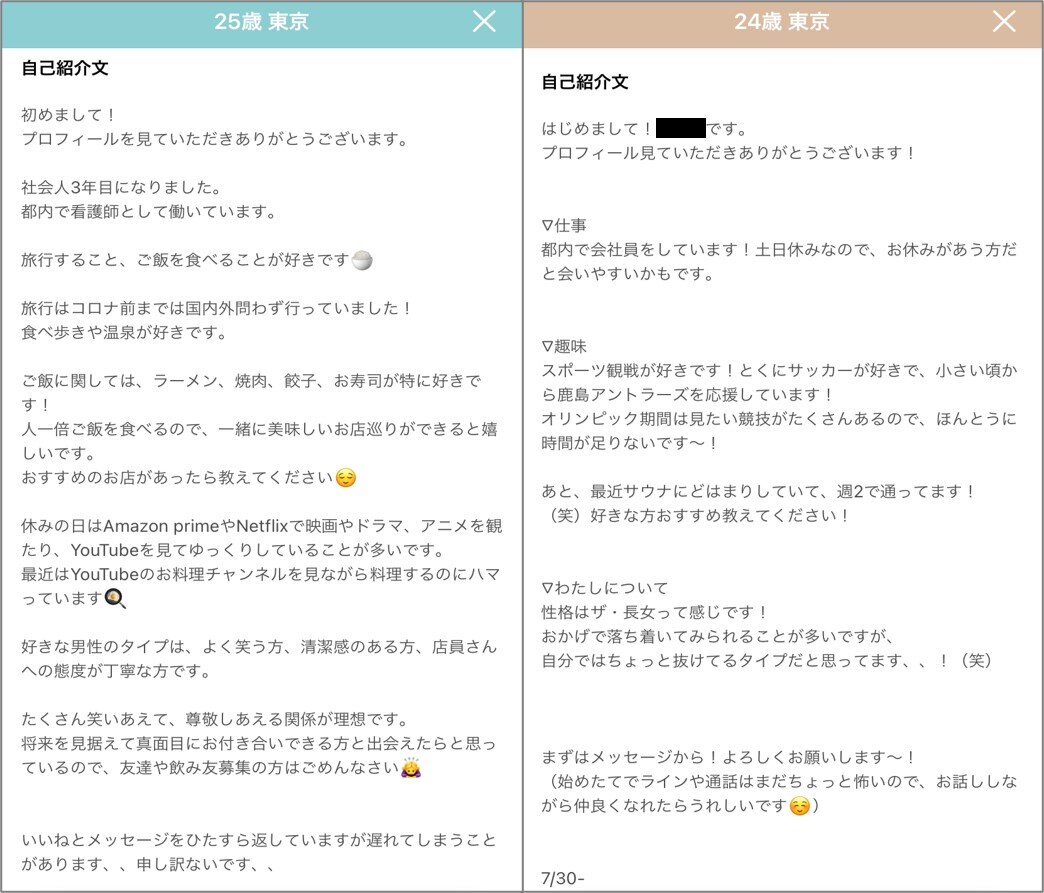親しみがある500文字程度の文なら、魅力を伝えるのにも、読むのにも丁度良く、相手の不安を払しょくできます。自己紹介文の例文があるアプリが多いので、参考にして書きましょう。