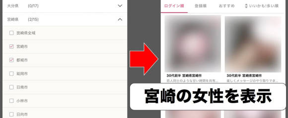 ただし、地域は絞りすぎないようにするのも大切です。絞りすぎると表示される異性の数が減り、好みの相手を見つけられなくなります。