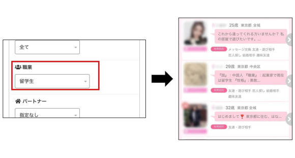 PCMAXには、留学生も多く登録しています。検索欄の「職業」の項目を「留学生」にして検索するだけで、沢山の女性がヒットします。