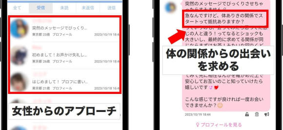 いきなり体の関係を求められて、実際に会ってみたら金銭を要求されたり、写真と全く違う人が来たりする可能性があります。