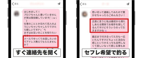 すぐに連絡先を聞いてきたり、セフレを希望してきたりと、男性に都合の良いメッセージを送ってくる女性は、業者か詐欺の可能性が高いです。