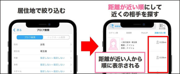 距離が近ければ移動にかかる労力が少ないので、遠い場所にいるよりも出会いやすいです。また、距離検索をしながら、年齢や身長などの条件も同時に絞って探せます。