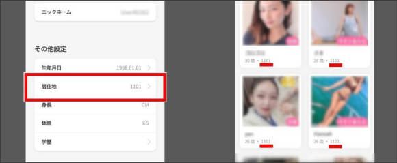 即ラブはユーザーの居住地が正しく表示されません。一部のユーザーは「東京」や「大阪」のように都道府県で表示されていますが、位置情報をONにしないと「1101」の表示になります。