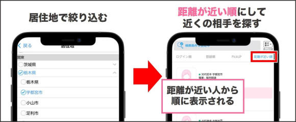 距離が近ければ移動にかかる労力が少ないので、遠い場所にいるよりも出会いやすいです。また、距離検索をしながら、年齢や身長などの条件も同時に絞って探せます。