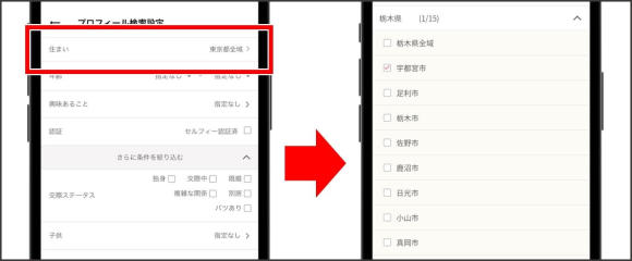 ワクワクメールで宇都宮の異性と出会うなら、プロフィール検索を利用しましょう。プロフィール検索では市町村まで居住地を絞って探せます。