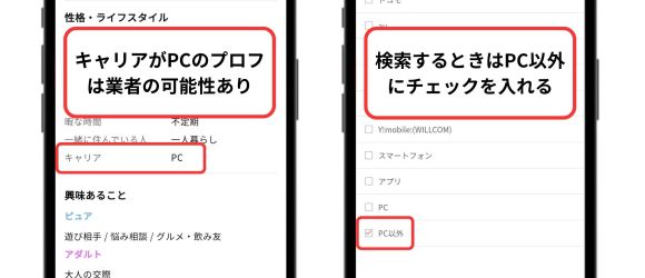 キャリアが「PC」になっている相手は、警戒したほうが良いでしょう。必ずとは限りませんが、ほとんどの素人女性は、ワクワクメールをアプリで使うからです。