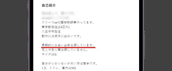 割り切り女性のプロフィールには、割り切りを表す隠語が書かれています。メッセージを送る前に、割り切り希望かどうかを見極めるのが重要です。