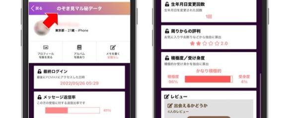 PCMAXの「のぞき見データ」を活用すれば、コスパ良く女性と出会えます。のぞき見データは、気になる女性のログイン時間や返信率を確認できるため、アプローチが刺さりやすい時間や業者の判断が可能です。