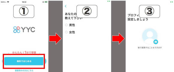 アプリ版YYCに再登録する手順です。アプリ版の登録にはメールアドレスや電話番号などの認証は必要なく、簡単に登録できます。